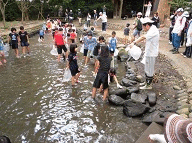 | 台風の影響で開催が危ぶまれましたが、小雨が降る程度であったので、足早に開始となりました。年齢で区切っての魚つかみでしたがたくさん捕まえる子や触るのが怖くて追いかけるだけになる子など様々でした。途中に降った小雨も子供達には関係なかったようで、夢中になって魚つかみをしていました。 |